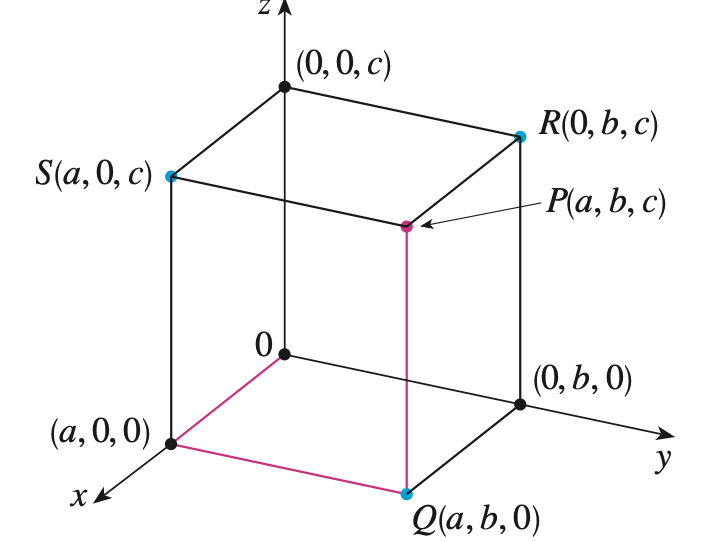 다음으로 3차원 좌표계에서 점의 위치를 표현하는 방법입니다. 생각보다 간단합니다. 임의의 점 $P(a, b, c)$가 주어졌다고 하겠습니다. 그러면 이 점의 좌표는 $x$-축 방향으로 $a$만큼, $y$-축 방향으로 $b$만큼, $z$-축 방향으로 $c$만큼 이동했다고 볼 수 있습니다. 이와 같이 3개의 실수로 점의 위치를 표현하는 3차원 좌표계를 "3차원 직교좌표계(three-dimensional rectangular coordinate system)"이라고 합니다. 그리고 이를 수학적으로 표현하면 아래와 같죠.
