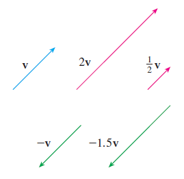 그렇다면 벡터에 스칼라 곱을 하면 어떻게 될까요? 위의 그림과 마찬가지로 양수인 스칼라를 곱하면 방향은 변하지 않고 그 스칼라만큼 배가 되어 크기가 늘어나게 됩니다. 그와 반면에 음수인 스칼라를 곱하면 방향은 기존 벡터의 180도 반대 방향이 되고 크기 역시 늘어나게 됩니다. 이를 통해서 두 벡터 사이의 뺄셈도 정의할 수 있게 됩니다.