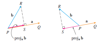 동일한 시점(initial point)를 공유하는 두 벡터 $\mathbf{a}$와 $\mathbf{b}$가 있다고 가정하자. 이때, 점 $S$를 벡터 $\vec{PQ}$ 상에 점 $R$과 수직을 이루는 수선의 발이라고 하자. 그러면, 벡터 $\vec{PS}$를 $\mathbf{b}$의 $\mathbf{a}$로의 사영(vector projection of $\mathbf{b}$ onto $\mathbf{a}$)이라고 하고 $\text{proj}_{\mathbf{a}} \mathbf{b}$로 표기한다.