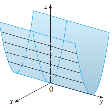 먼저, 포물선 기둥(parabolic cylinder)부터 보도록 하겠습니다. 예를 들어, $z = x^{2}$과 같은 함수가 있습니다. 이 함수를 잘 보시면 $y$에 대한 제한이 존재하지 않습니다. 따라서, $y$ 축을 따라서 쭉 펼쳐져있을 겁니다. 그리고 임의의 $k$에 대해서 $y = k$로 위 식을 잘라보면 $zx$평면에서 포물선 $z = x^{2}$를 얻을 수 있습니다. 즉, 위 방정식은 $zx$ 평면의 포물선이 $y$축으로 쭉 펼쳐진 모양이라고 볼 수 있겠네요.