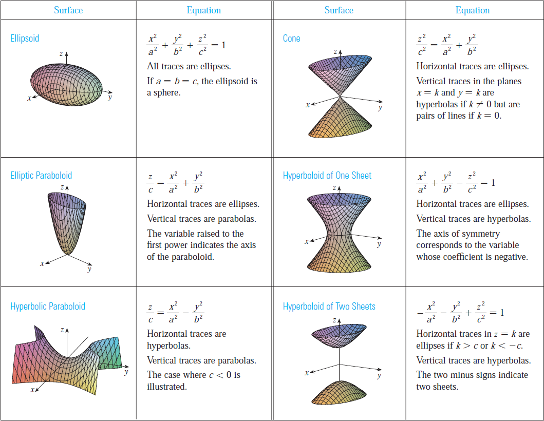 여기서, $A, B, ..., J$는 임의의 상수이다. 이때, 각 계수에 따라서 아래와 같이 다양한 이차곡면을 얻을 수 있다.