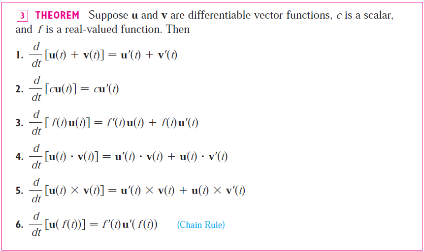 벡터함수 $\mathbf{r}(t) = <f(t), g(t), h(t)>$가 주어지고 각 성분함수 $f, g, h$ 모두 미분가능하다고 할 때, 벡터함수의 도함수 $\mathbf{r}^{'}(t) = <f^{'}(t), g^{'}(t), h^{'}(t)>$이다.