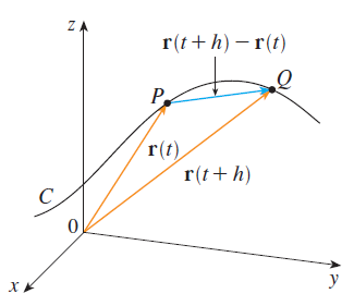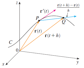 $$\frac{d\mathbf{r}}{dt} = \mathbf{r}^{'}(t) = \lim_{h \rightarrow 0} \frac{\mathbf{r}(t + h) - \mathbf{r}(t)}{h}$$