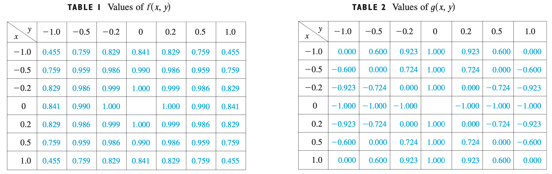 왼쪽과 오른쪽 표는 각각 $f(x, y)$과 $g(x, y)$의 수치적 결과를 보여주고 있습니다. 두 함수의 공통적인 차이점은 $(0, 0)$에서 분모가 0 되기 때문에 정의되지 않는다는 점이죠. 하지만, 그 주변에서의 경향성은 확연히 다릅니다. $f(x, y)$ 같은 경우에 $(0, 0)$의 주변인 $(-0.2, 0), (+0.2, 0), (0, -0.2), (0, +0.2)$에서는 전부 $f(x, y) = 1$입니다. 그와 반면에 $g(x, y)$는 $(-0.2, 0), (+0.2, 0)$에서는 1이지만, $(0, -0.2), (0, +0.2)$에서는 -1입니다. 해당 테이블이 다변수 함수의 극한에 대한 개념을 여실히 드러내고 있습니다. 즉, $(0, 0)$의 극한값이 존재한다는 것은 $(0, 0)$ 주변의 모든 값들이 동일한 값으로 일치해야한다는 것을 의미하죠.