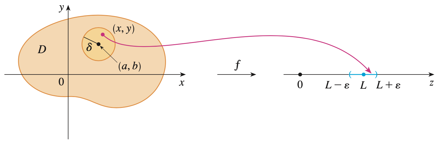 함수 $f$가 정의역 $D$에서 정의되었다고 하자. 함수 $f(x, y)$의 $(a, b) \in D$로의 극한은 임의의 양의 실수 $\epsilon > 0$에 대해서 $(x, y) \in D$와 $0 < \sqrt{(x - a)^{2} + (y - b)^{2}} < \delta$일 때 $|f(x, y) - L| < \epsilon$를 만족하는 $\delta > 0$가 존재하면 다변수 함수 $f(x, y)$의 극한이 존재하고 $\lim_{(x, y) \rightarrow (a, b)} f(x, y) = L$라 표기한다.