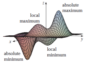다변수 함수 $f$가 주어졌을 때 점 $(a, b)$ 근방의 $(x, y)$에 대해서 $f(a, b) \ge f(x, y)$를 만족하면 점 $(a, b)$는 지역최대점이고 $f(a, b)$는 지역최댓값이 된다. 만약, $f(a, b) \le f(x, y)$를 만족하면 점 $(a, b)$는 지역최소점이고 $f(a, b)$는 지역최솟값이 된다.