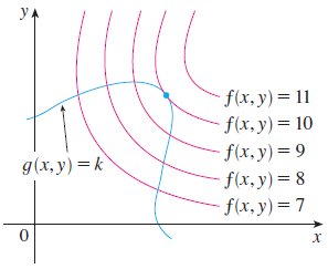 라그랑주 승수법의 기본 개념을 이해하기 위해 위 그림을 함께 설명하도록 하겠습니다. 여기서 $y = f(x, y)$의 다변수 함수가 주어졌다고 가정하겠습니다. 그리고 $f(x, y) = C$로 이어진 분홍선 선 그래프는 함수 $y = f(x, y)$의 등고선을 의미합니다. 이제부터 저희가 원하는 것은 $g(x, y) = k$라는 제약 조건 하에서 함수 $y = f(x, y)$의 극값(extreme value)를 찾는 것입니다. 즉, 저희는 함수 $y = f(x, y)$와 $g(x, y) = k$와 서로 만나면서 최대가 되는 값을 찾아야하죠. 위 그림에서 $C = 7, 8, 9$일 때는 $g(x, y) = k$와 만나기는 하지만 최대는 아니죠. 그와 반면에 $C = 11$일 때는 $g(x, y) = k$와 만나지도 못합니다. 따라서, 이 경우에 극값은 $C = 11$이 되는 것이죠. 그리고 그 점은 위 그림에서 파란색 점으로 표시되어 있습니다. 이 점을 $(x_{0}, y_{0})$라고 하겠습니다. 이때, 이 점에서 두 함수 $f$와 $g$의 기울기벡터가 평행한 것을 볼 수 있죠. 따라서, 이에 대한 새로운 방정식을 쓸 수 있습니다.