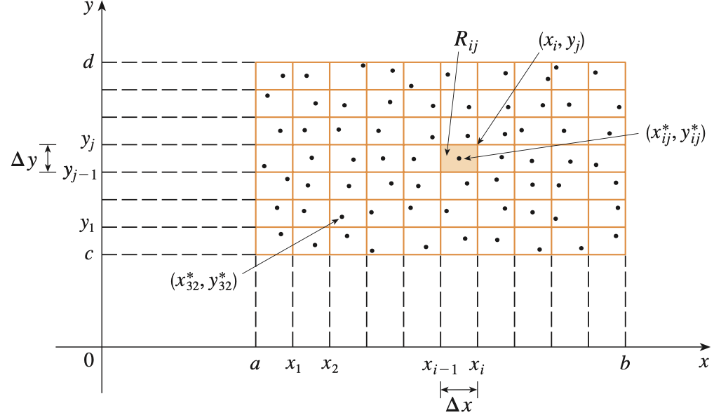 $$V_{mn} = \sum_{i= 1}^{m} \sum_{j = 1}^{n} V_{ij} = \sum_{i = 1}^{m} \sum_{j = 1}^{n} f(x_{ij}^{*}, y_{ij}^{*}) \Delta A$$