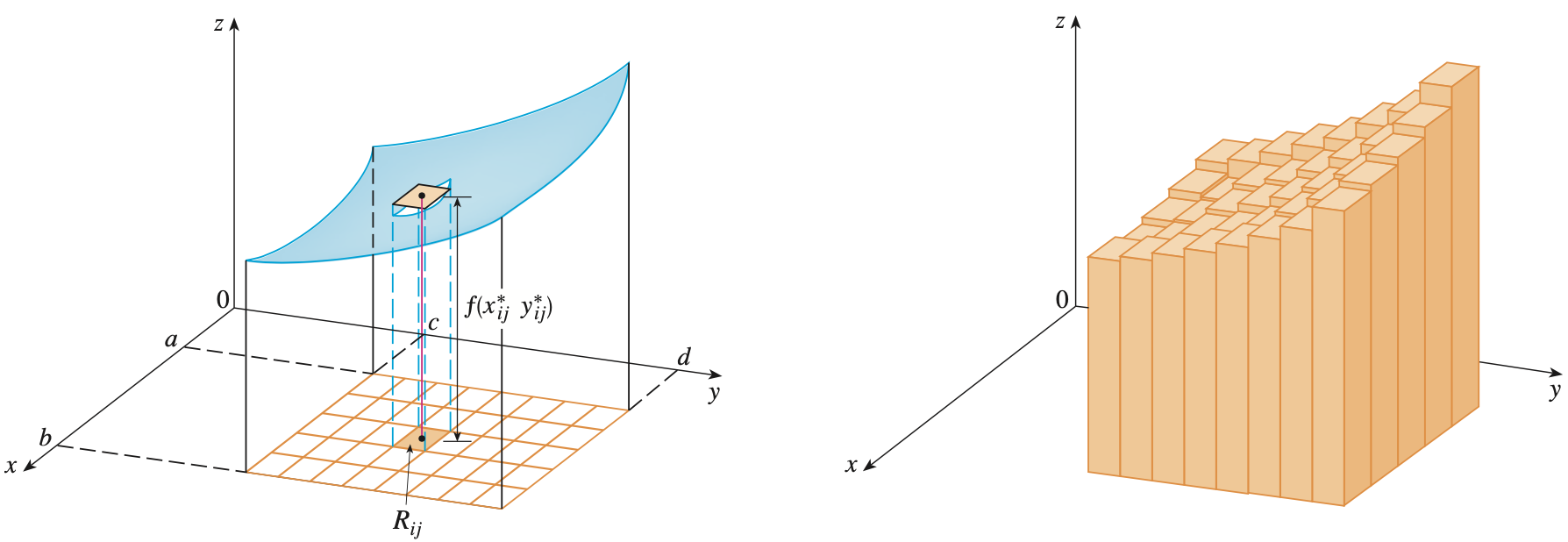 $$V = \lim_{m \rightarrow \infty} \lim_{n \rightarrow \infty} \sum_{i = 1}^{m} \sum_{j = 1}^{n} f(x_{ij}^{*}, y_{ij}^{*}) \Delta A = \int \int_{R} f(x, y) \; dA$$