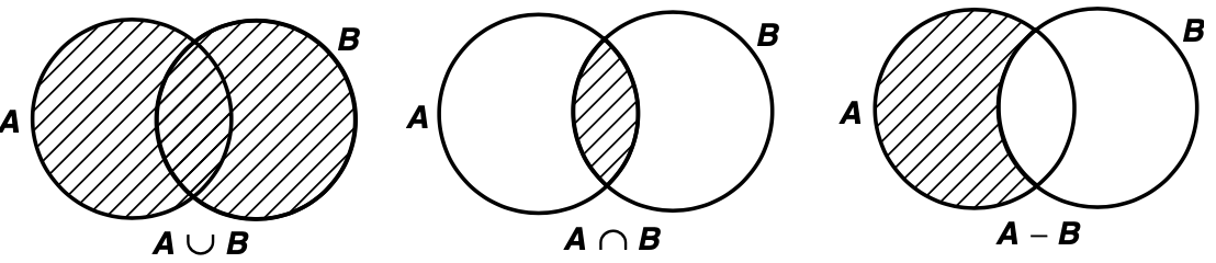 지금까지 저희는 두 개의 집합에 대한 3가지 연산(합집합, 교집합, 차집합)에 대해서 알아보았습니다. 그리고 각 연산 결과를 벤다이어그램으로 그려보면 위와 같은 그림을 얻을 수 있습니다. 특히, 차집합 같은 경우에는 집합 $A$에는 속하지만 집합 $B$에는 속하지 않는 집합을 의미하기 때문에 집합 $A$에서 $A \cap B$가 빠진것을 볼 수 있습니다. 일반적으로 합집합과 교집합과 다르게 차집합은 교환법칙이 성립되지 않습니다. 즉, $A - B \neq B - A$임을 쉽게 아실 수 있을겁니다. 이때, 집합 $A$와 집합 $B$의 차집합을 집합 $A$에 대한 집합 $B$의 여집합(complement)라고도 합니다.