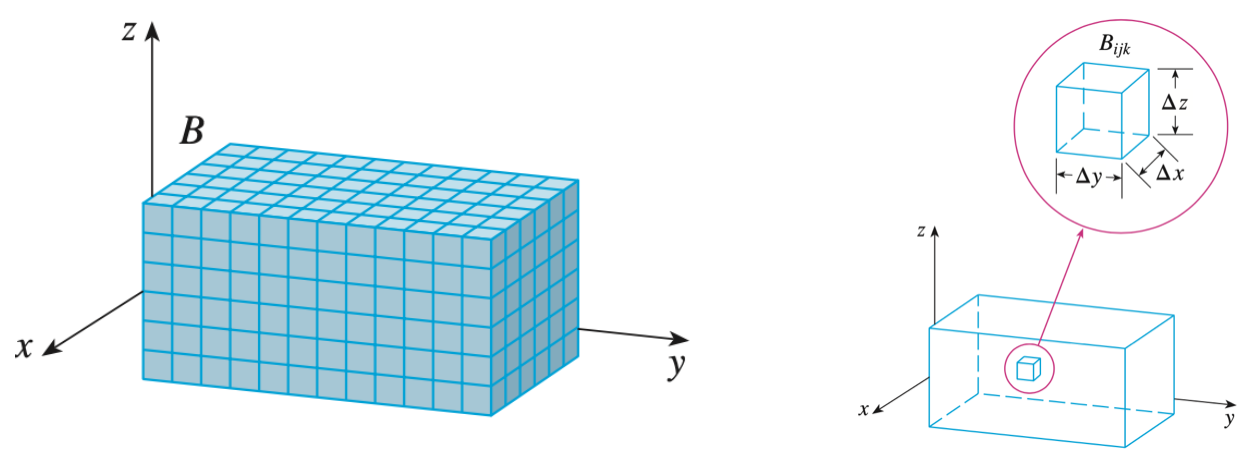 $$\int \int \int_{B} f(x, y, z) \; dV = \lim_{l, m, n \rightarrow \infty} \sum_{i = 1}^{l} \sum_{j = 1}^{m} \sum_{k = 1}^{n} f(x_{ijk}^{*}, y_{ijk}^{*}, z_{ijk}^{*}) \Delta V$$