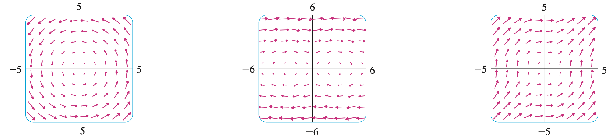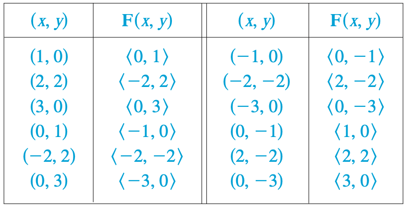 1). $D$를 $\mathbb{R}^{2}$의 부분집합이라고 하자. $\mathbb{R}^{2}$에서의 벡터장은 영역 $D$의 각 점 $(x, y)$에 대한 이차원 벡터함수 $\mathbf{F}(x, y)$에 의해 대응되는 벡터들의 집합이다.