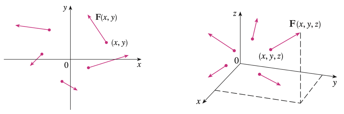 2). $D$를 $\mathbb{R}^{3}$의 부분집합이라고 하자. $\mathbb{R}^{3}$에서의 벡터장은 영역 $D$의 각 점 $(x, y, z)$에 대한 삼차원 벡터함수 $\mathbf{F}(x, y, z)$에 의해 대응되는 벡터들의 집합이다.