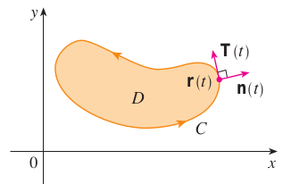양의 방향을 가지는 곡선 $C$가 조각별로 부드럽고 단순하게 닫혀있는 곡선이라고 하고 $D$를 곡선 $C$에 의해 제한되는 영역이라고 할 때 영역 $D$를 포함하는 열린 영역에서 정의된 벡터함수 $\mathbf{F} = P \mathbf{i} + Q \mathbf{j}$의 성분함수 $P$와 $Q$가 연속 편도함수를 가진다고 가정하면 아래의 식이 성립한다.