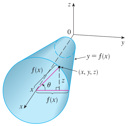 위 그림을 보면서 설명하도록 하죠. 일단, $x$축을 중심으로 회전시켰기 때문에 $x$은 $a \le x \le b$를 제외한 어떠한 제약도 존재하지 않습니다. 이제 저희가 신경써야할 변수는 $y$와 $z$가 되죠. 이때, 중요한 점은 $y = f(x)$를 $x$축을 중심으로 회전시켰다는 점입니다. 따라서, 모든 곡면에서 $x$축까지의 길이는 $f(x)$가 되죠. 저희는 이 사실을 이용할 것입니다. 곡면의 임의의 점 $(x, y, z)$를 표현하기 위해서 각도 $\theta$를 도입하도록 하겠습니다. $\theta$는 회전각도를 의미하게 되는 데 위 그림을 보시면 $y$와 $z$ 모두 이 변수에 대해서 의존적임을 알 수 있습니다. 이제 위 그림에서와 같이 빨간색 실선을 빗면으로 하는 직각삼각형을 생각하면 실선과 곡면이 만나는 점이 $(x, y, z)$가 되기 때문에 $y = f(x)\cos(\theta)$ 그리고 $z = f(x) \sin(\theta)$가 되는 것을 쉽게 알 수 있습니다. 이때, 매개변수인 $x\theta$ 평면에서의 정의역은 $D = [a, b] \times [0, 2\pi]$가 됩니다.