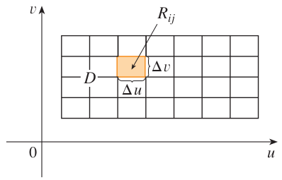 저희는 문제를 간단하게 하기 위해서 $uv$ 평면에 존재하는 정의역을 직사각형 영역이라고 가정하겠습니다. 그리고 해당 영역을 등분하여 가로 $\Delta u$, 세로 $\Delta v$를 갖는 작은 직사각형 영역 $R_{ij}$로 나누도록 하겠습니다. 그리고 이 영역의 표본점을 $(u_{i}^{*}, v_{j}^{*})$라고 하도록 하겠습니다.