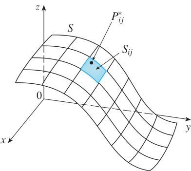 $$\iint_{S} f(x, y, z) \; dS = \lim_{m, n \rightarrow \infty} \sum_{i = 1}^{m} \sum_{j = 1}^{n} f(P_{ij}^{*}) \Delta S_{ij}$$