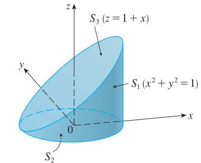 예제2. 곡면 $S$가 원통 곡면 $S_{1} : x^{2} + y^{2} = 1$과 그 밑면은 $z = 0$ 상에서 $S_{2} : x^{2} + y^{2} \le 1$이고 $S_{3} : z = 1 + x$로 이루어진 곡면이라고 할 때, 곡면 $S$ 상에서 면적분 $\iint_{S} z \; dS$를 계산하라.