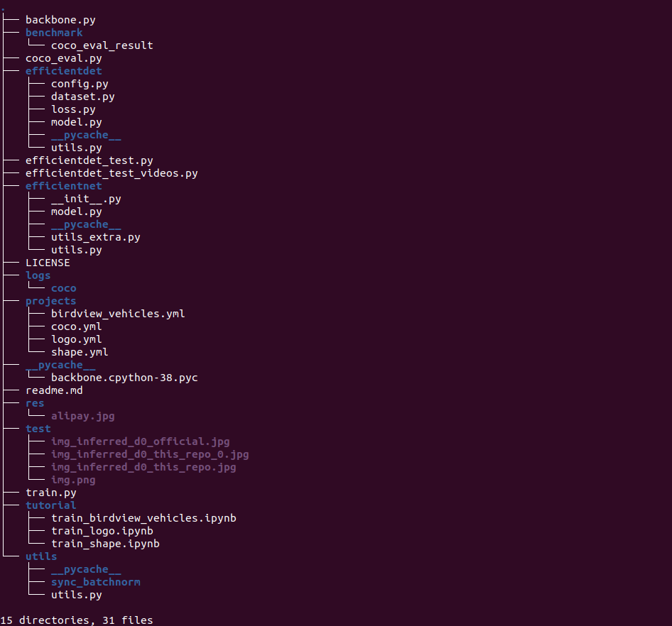 마지막으로 EfficientDet의 실제 코드를 분석하고 학습 및 평가 코드를 분석하고 마치도록 하겠습니다. 전체 코드는 링크를 참조해주시길 바랍니다. 공식 코드 문제는 아니지만 학습 코드가 추가된 재구현 코드이므로 아마 큰 도움이 될 거 같습니다. 전체 폴더 구조는 다음과 같습니다.