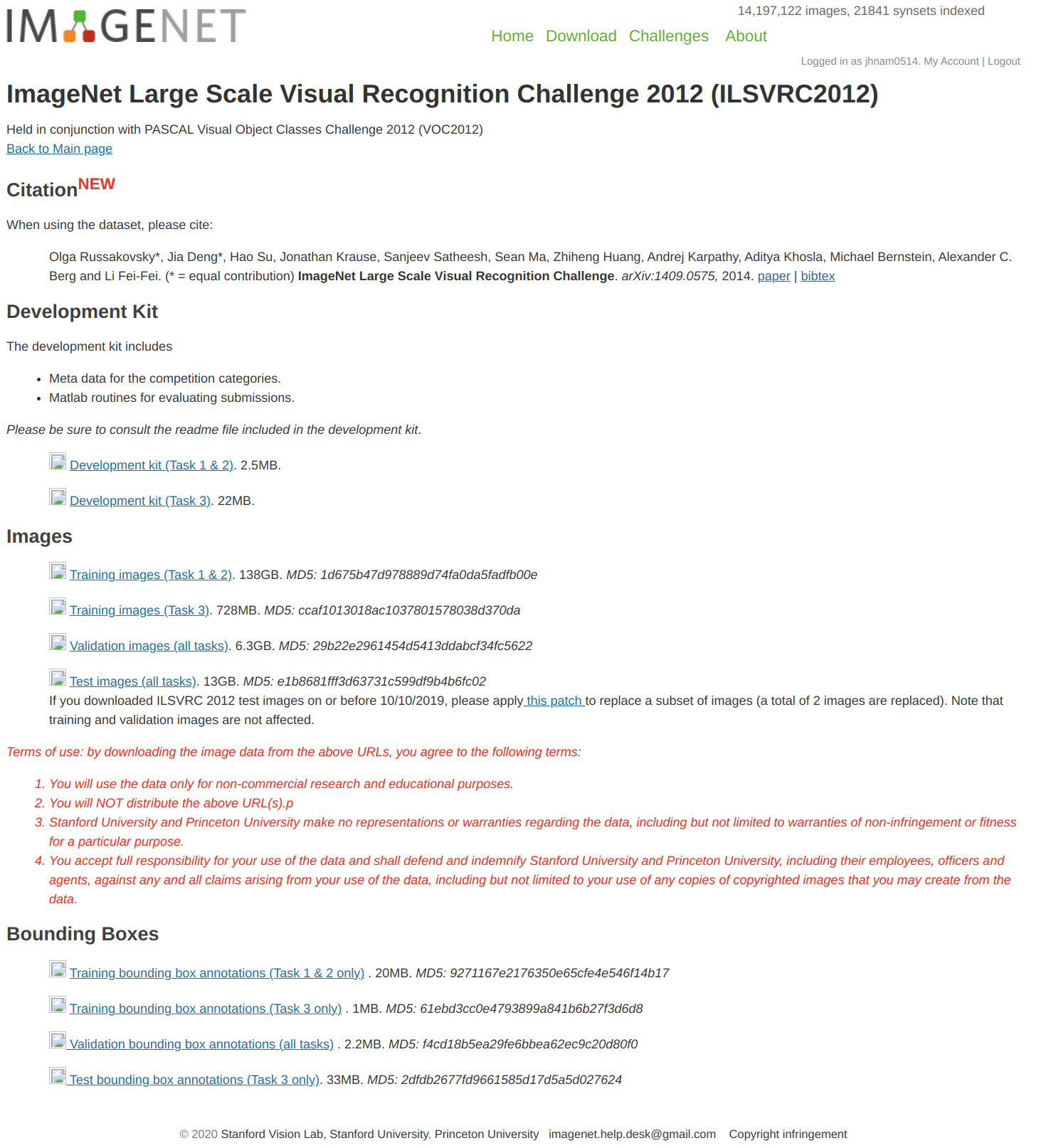 ImageNet Dataset은 위 링크에서 로그인 후 직접 다운로드 가능합니다. 주의할 점은 gmail이나 hotmail과 같은 도메인은 사용할 수 없으며 학교 및 기관 이메일을 사용하셔야 회원가입을 진행할 수 있습니다.