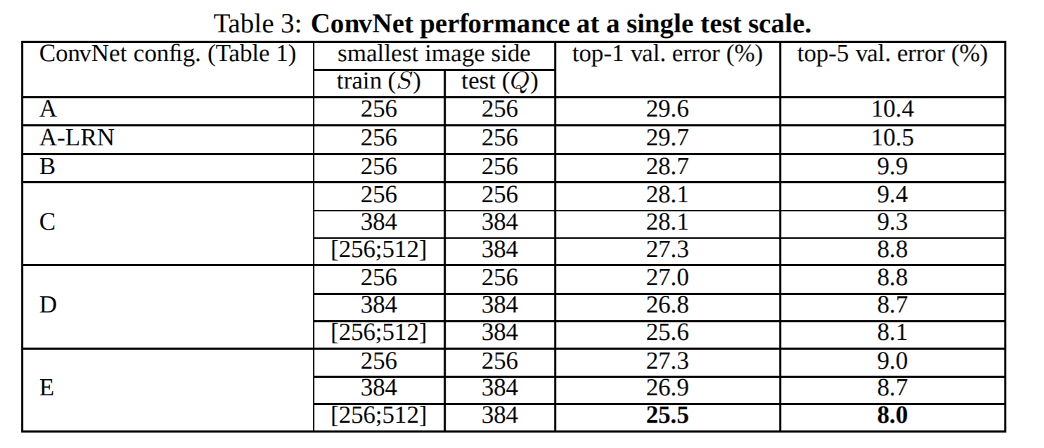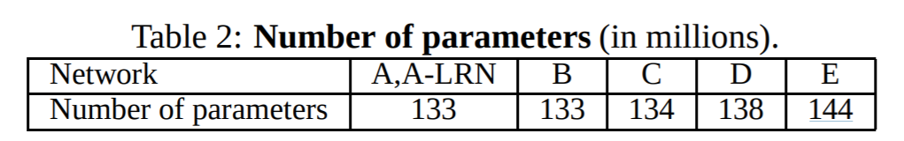 Table2에서는 각 모델의 configuration에 따른 모델 파라미터의 개수를 보여주고 있습니다. 당연하지만, 네트워크가 점점 깊어질수록 그만큼 사용하는 가중치가 많아지기 때문에 파라미터가 많아지게 됩니다. 여기서 단위는 백만으로 가장 많은 파라미터를 가지는 VGG19는 약 144,000.000개 (1억 4천4백만개)의 파라미터를 가집니다.