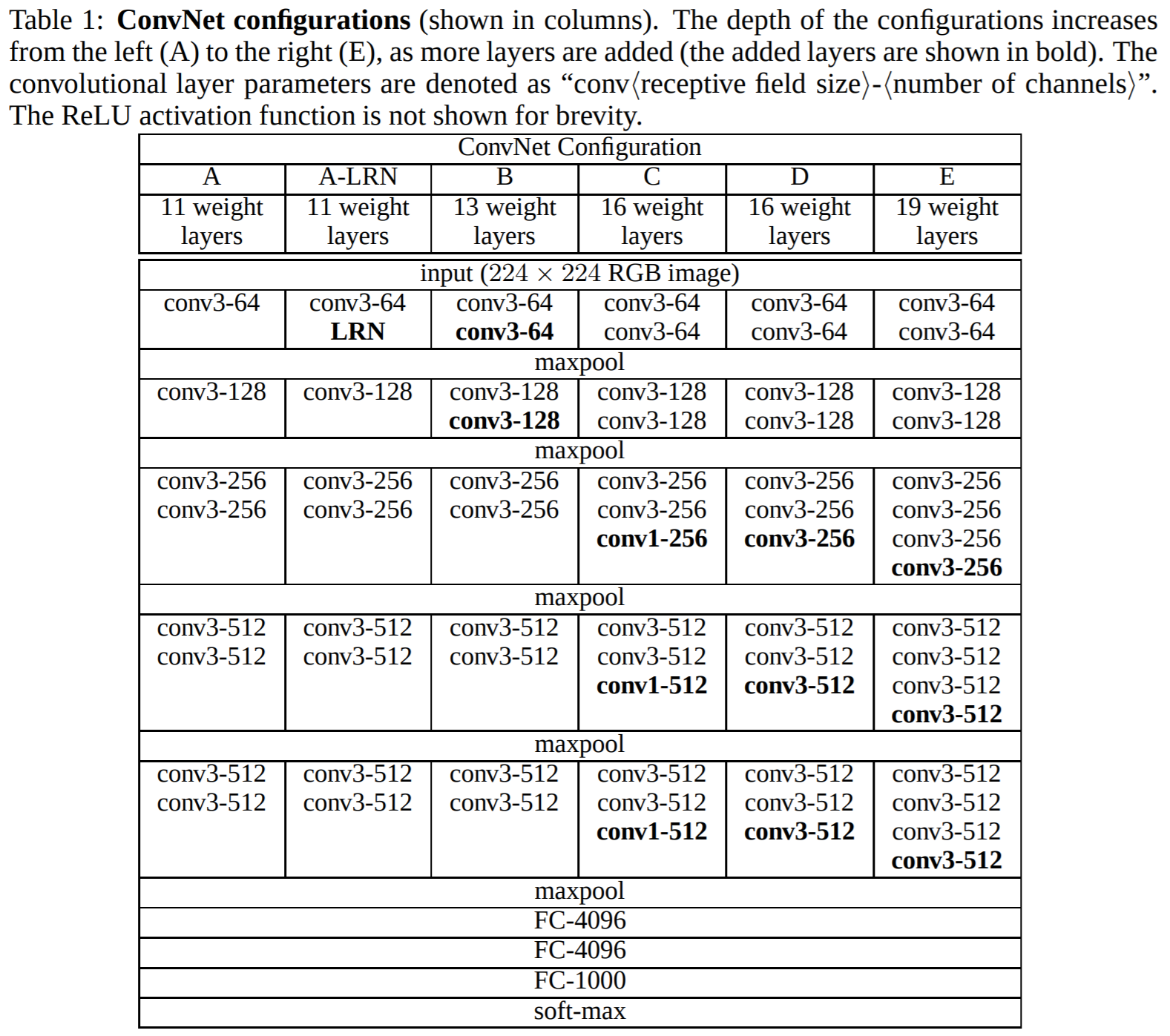 본 논문에서는 VGGNet의 configuration에 따라서 6가지 변형이 존재합니다. 첫번째 행은 각 모델의 configuration에 따라 가중치를 가지는 계층의 개수를 알려주고 있습니다. 일반적으로 저희가 VGG11, VGG16, VGG19 이렇게 표기하는 것은 가중치를 가지는 계층의 개수가 각각 11개, 16개, 19개임을 의미하죠. 이러한 표기법은 나중에 소개시켜드릴 ResNet에서도 이어지고 최근 논문의 대부분에서 이와 같은 표기법을 선택하고 있습니다.