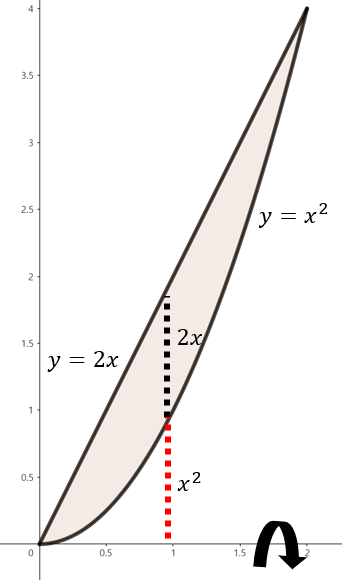 (a). $y = 2x, y = x^{2}$으로 둘러쌓인 영역을 $x$축 기준으로 회전