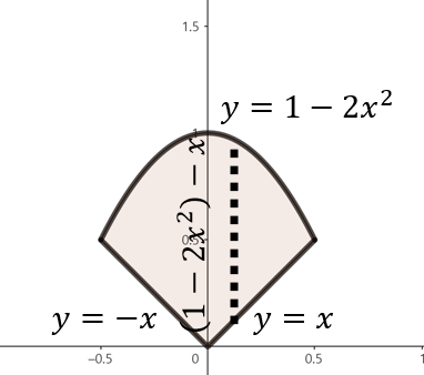 주어진 함수로 둘러쌓인 영역을 그림으로 그리면 위와 같이 그릴 수 있다. 여기서, 점 $x$에서 직사각형의 높이는 $(1 - 2x^{2}) - x = 1 - x - 2x^{2}$이다. 이제, 구간 $-\frac{1}{2} \le x \le \frac{1}{2}$에서 영역의 넓이를 다음과 같이 구할 수 있다.