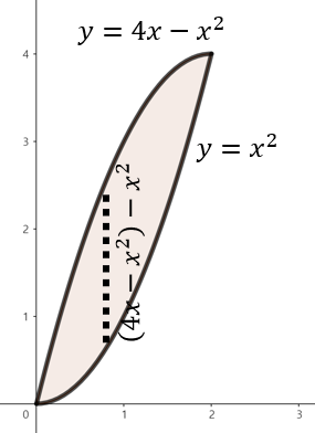 주어진 함수로 둘러쌓인 영역을 그림으로 그리면 위와 같이 그릴 수 있다. 여기서, 점 $x$에서 직사각형의 높이는 $(4x - x^{2}) - x^{2} = 4x - 2x^{2}$이다. 이제, 구간 $0 \le x \le 2$에서 영역의 넓이를 다음과 같이 구할 수 있다.