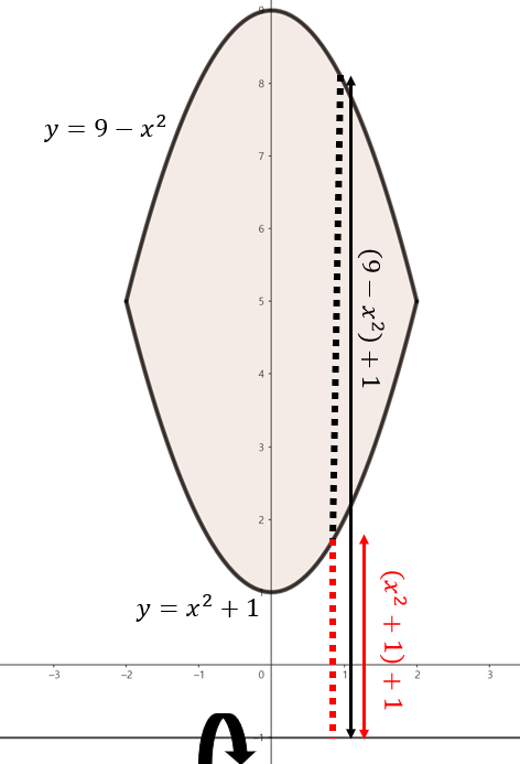주어진 함수로 둘러쌓인 영역을 그림으로 그리면 위와 같이 그릴 수 있다. 여기서, 점 $x$에서 $y = -1$축을 기준으로 회전했을 때 얻을 수 있는 회전체 단면은 반지름이 $(9 - x^{2}) + 1 = 10 - x^{2}$인 원에서 반지름이 $(x^{2} + 1) + 1 = x^{2} + 2$인 원을 뺀 것과 동일하다. 따라서, 해당 구간의 단면은 $(10 - x^{2})^{2} \pi - (x^{2} + 2)^{2} \pi = \left( -24x^{2} + 96 \right) \pi$의 넓이를 가진다. 이제, 구간 $-2 \le x \le 2$에서 주어진 영역을 $y = -1$축으로 회전시켰을 때 얻을 수 있는 회전체의 부피를 다음과 같이 구할 수 있다.