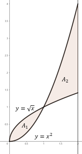 주어진 함수로 둘러쌓인 영역을 그림으로 그리면 위와 같이 그릴 수 있다. 주의할 점은 $x = 1$을 기준으로 두 개의 영역에 대한 넓이를 따로 구해야한다. 따라서, 구간 $0 \le x \le 1$에서 직사각형의 높이는 $\sqrt{x} - x^{2}$이고 구간 $1 \le x \le 2$에서 직사각형의 높이는 $x^{2} - \sqrt{x}$이다. 따라서, 전체 구간 $0 \le x \le 2$에서 영역의 넓이는 다음과 같이 구할 수 있다.