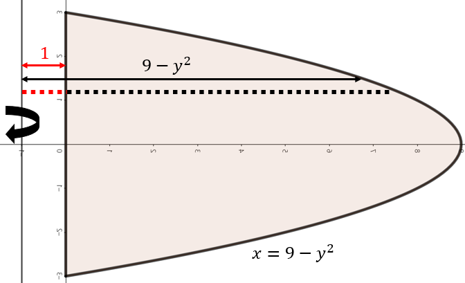 (c). $x = 0, x = 9 - y^{2}$으로 둘러쌓인 영역을 $x = -1$을 기준으로 회전