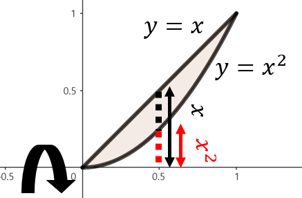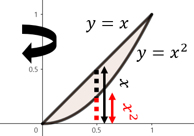 주어진 함수로 둘러쌓인 영역을 그림으로 그리면 위와 같이 그릴 수 있다. 여기서, 점 $x$에서 $y$축을 기준으로 회전했을 때 얻을 수 있는 회전체 단면의 높이는 $x - x^{2}$이다. 이제, 구간 $0 \le x \le 1$에서 주어진 영역을 $y$축으로 회전시켰을 때 얻을 수 있는 회전체의 부피를 실린더 방법을 이용해 다음과 같이 구할 수 있다.