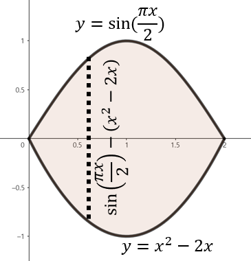 주어진 함수로 둘러쌓인 영역을 그림으로 그리면 위와 같이 그릴 수 있다. 여기서, 점 $x$에서 직사각형의 높이는 $\sin (\frac{\pi x}{2}) - x^{2} + 2x$이다. 이제, 구간 $0 \le x \le 2$에서 영역의 넓이를 다음과 같이 구할 수 있다.