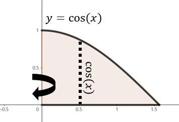 $y = \cos(x), x = \frac{\pi}{2}, y = 0$으로 둘러쌓인 영역을 $y$축을 중심으로 회전한 회전체의 부피를 의미한다.
