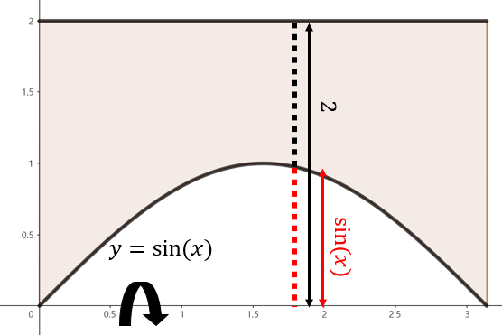 $y = \sin(x), x = 0, x = \pi, y = 2$으로 둘러쌓인 영역을 $x$축을 중심으로 회전한 회전체의 부피를 의미한다.