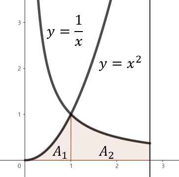 주어진 함수로 둘러쌓인 영역을 그림으로 그리면 위와 같이 그릴 수 있다. 주의할 점은 $x = 1$을 기준으로 두 개의 영역에 대한 넓이를 따로 구해야한다. 따라서, 구간 $0 \le x \le 1$에서 직사각형의 높이는 $x^{2}$이고 구간 $1 \le x \le e$에서 직사각형의 높이는 $\frac{1}{x}$이다. 따라서, 전체 구간 $0 \le x \le e$에서 영역의 넓이는 다음과 같이 구할 수 있다.