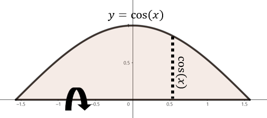 $y = \cos(x), x = -\frac{\pi}{2}, x = \frac{\pi}{2}, y = 0$으로 둘러쌓인 영역을 $x$축을 중심으로 회전한 회전체의 부피를 의미한다.