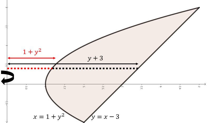 (b). $x = 1 + y^{2}, y = x - 3$으로 둘러쌓인 영역을 $y$축 기준으로 회전