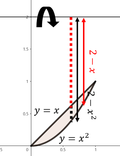 주어진 함수로 둘러쌓인 영역을 그림으로 그리면 위와 같이 그릴 수 있다. 여기서, 점 $x$에서 $y = 2$을 기준으로 회전했을 때 얻을 수 있는 회전체 단면은 반지름이 $2 - x^{2}$인 원에서 반지름이 $2 - x$인 원을 뺀 것과 동일하다. 따라서, 해당 구간의 단면은 $(2 - x^{2})^{2} \pi - (2 - x)^{2} \pi = \left( x^{4} - 5x^{2} + 4 \right) \pi$의 넓이를 가진다. 이제, 구간 $0 \le x \le 1$에서 주어진 영역을 $y = 2$축으로 회전시켰을 때 얻을 수 있는 회전체의 부피를 다음과 같이 구할 수 있다.