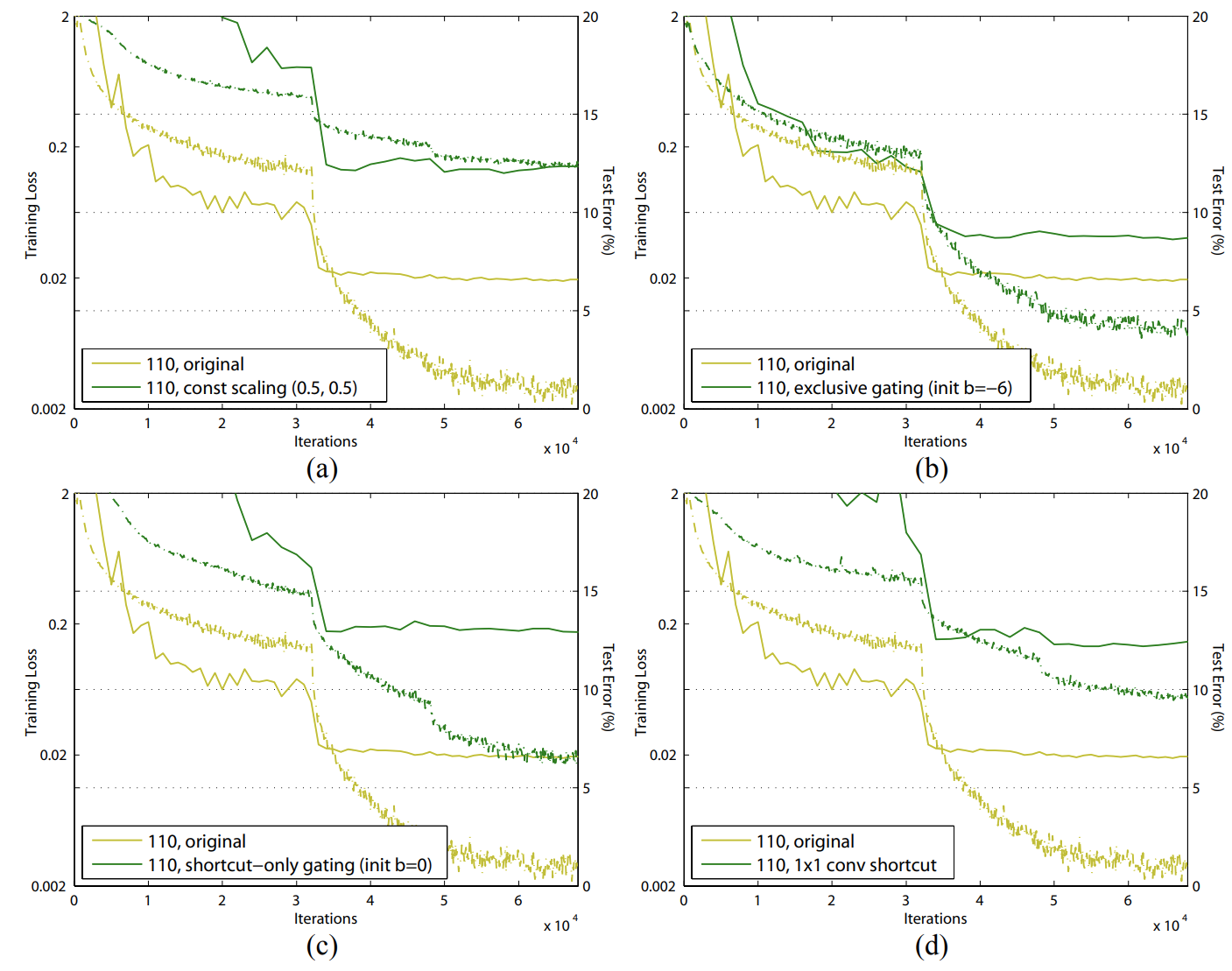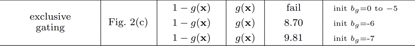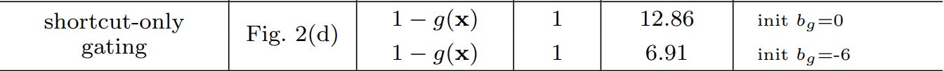 실험적으로는 역시 original 보다도 성능이 낮은 것을 관찰할 수 있습니다. 다만, 한 가지 사실은 exclusive gating을 통해 학습할 때는 $b_{g}$의 초기화값이 지대한 영향을 끼친다는 사실입니다. 그런데 여기서 놀라운 결과는 학습 결과 $g(\mathbf{x})$가 거의 0으로 수렴했다는 점 입니다. 이는 shortcut path가 gating 없이 그대로 통과하는 것이 더 중요하다는 사실을 뒷받침해주고 있죠. 하지만, $g(\mathbf{x})$가 0으로 수렴했기 때문에 residual path의 영향력이 감소하여 성능이 감소한 것으로 해석할 수 있습니다.