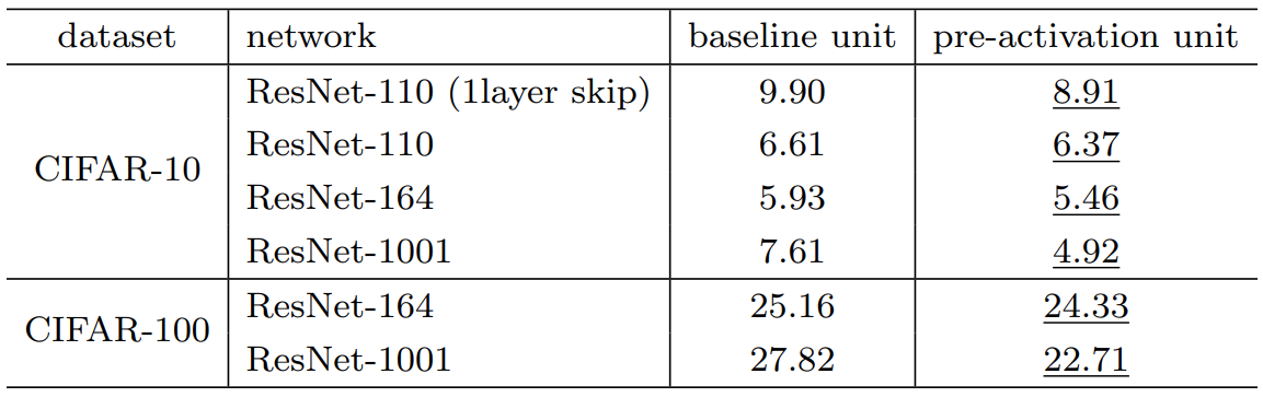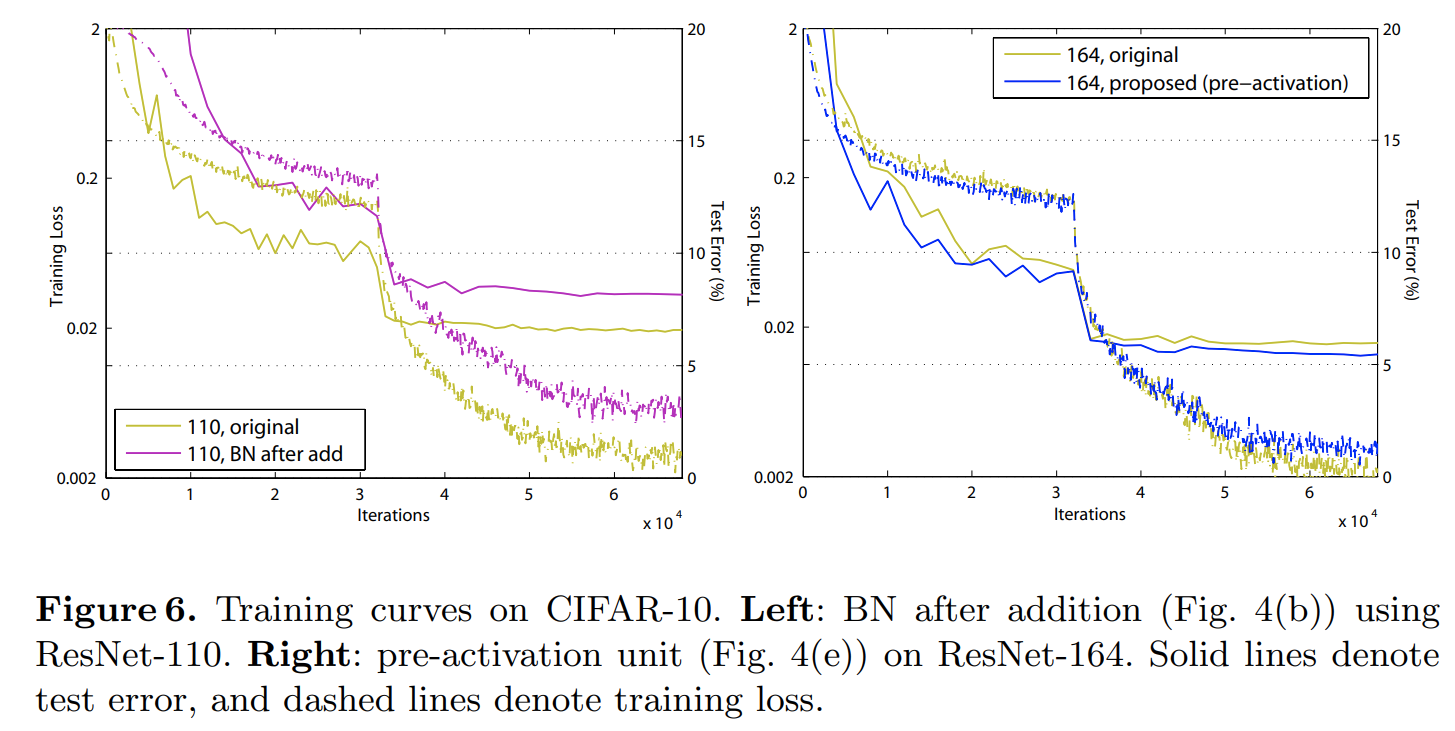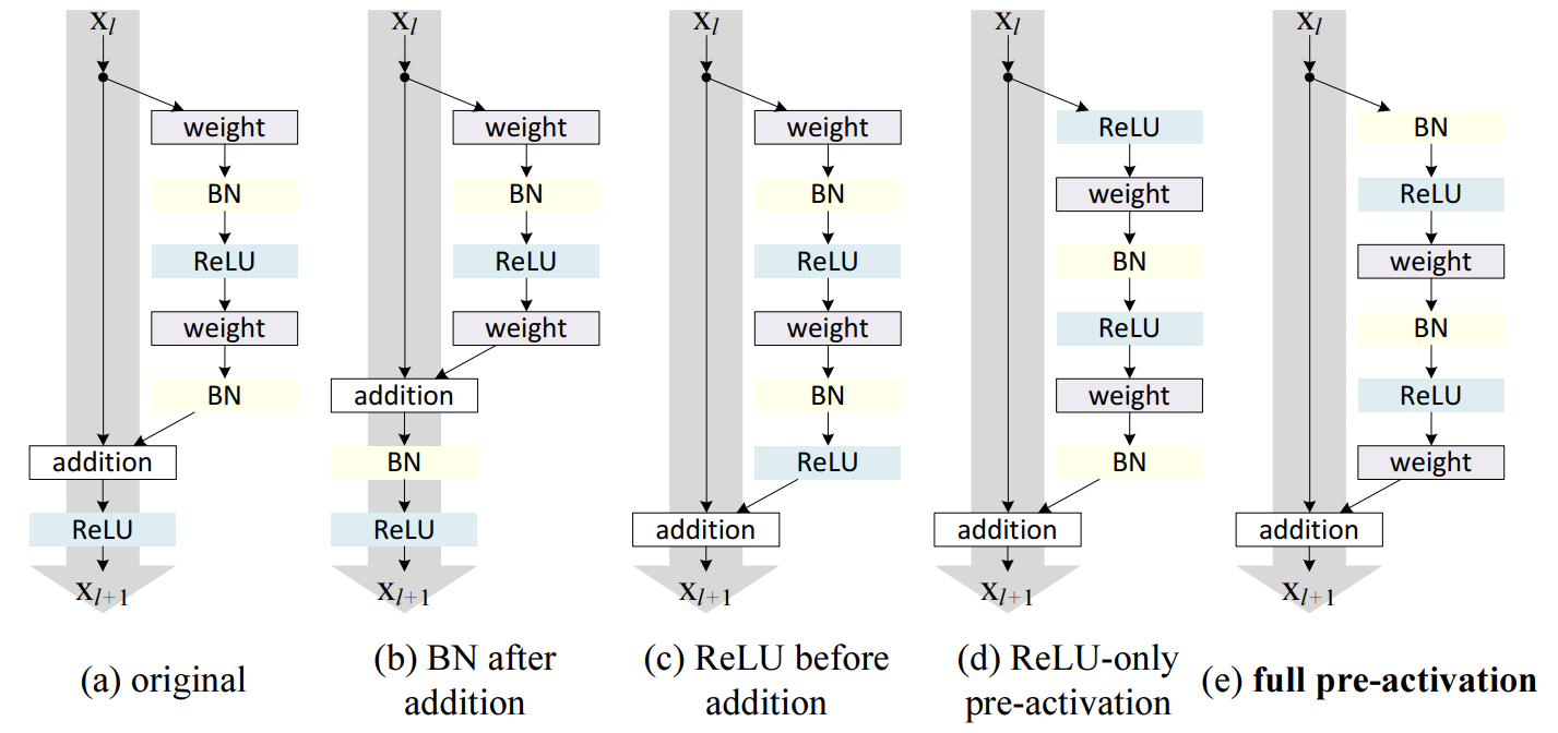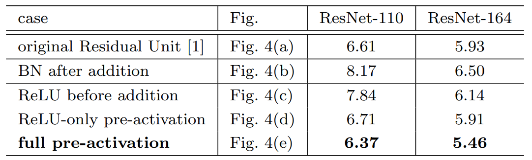 이번에는 위 그림과 같이 Residual Block 내에서 활성화 함수의 위치를 다양하게 바꾸어가며 성능을 측정하였습니다.