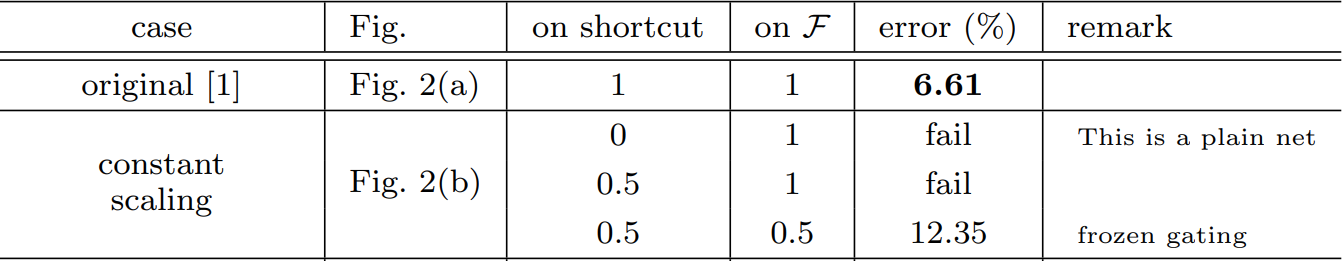 실제로 그림 (b)와 같이 학습하면 최적화가 안되는 것을 볼 수 있습니다. 실제로 shortcut에는 0.5 그리고 Residual Block에서는 0.5 만큼 비율을 할당해서 학습했을 때 성능이 크게 감소한 것을 볼 수 있죠.