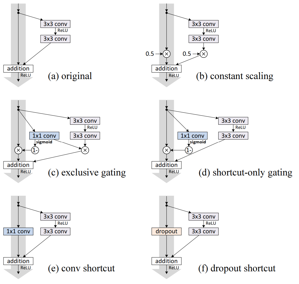 이번 절에서는 위 그림과 같이 Skip Connection $h$을 다양하게 변형하여 성능을 분석합니다. 총 6가지의 변형을 만들었으며 가장 먼저, Constant Scaling에 대한 설명을 해보도록 하겠습니다.