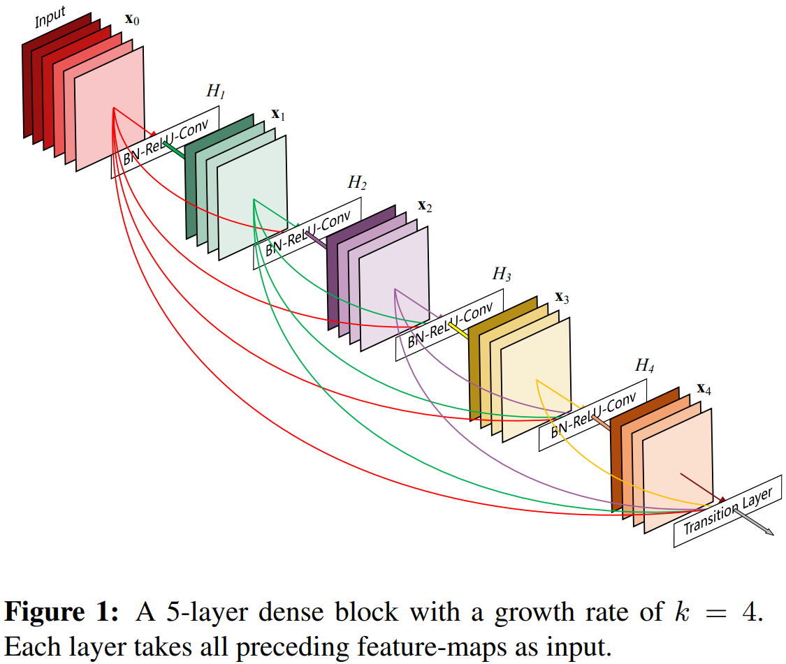 DenseBlock 내의 비선형변환 $H_{l}$은 모두 $k$개의 특징 맵을 출력한다고 가정하겠습니다. 그러면 한 개의 DenseBlock에서 총 $l$개의 계층이 있다고 가정하면 해당 DenseBlock에서 $l$번째 계층의 입력 특징맵의 채널 개수는 $k_{0} + k (l - 1)$입니다. 잘 보시면 이는 초항이 $k_{0}$이고 공차가 $k$인 등차수열의 모습입니다. $k_{0}$은 이전 DenseBlock의 출력 특징맵의 채널개수이므로 조절불가입니다. 하지만, $k$는 저희가 조절하여 특징맵의 차원을 조절할 수 있습니다. 만약, $k$가 너무 크면 특징맵의 차원이 굉장히 커지기 때문에 계산량이 너무 커집니다. 이를 방지하기 위해 등차수열의 형태로 한 개의 DenseBlock 내 존재하는 계층들이 모두 동일한 크기의 출력 특징맵을 가지도록 만드는 것이죠. 이를 growth rate라고 정의하고 DenseNet의 하이퍼파라미터가 됩니다.