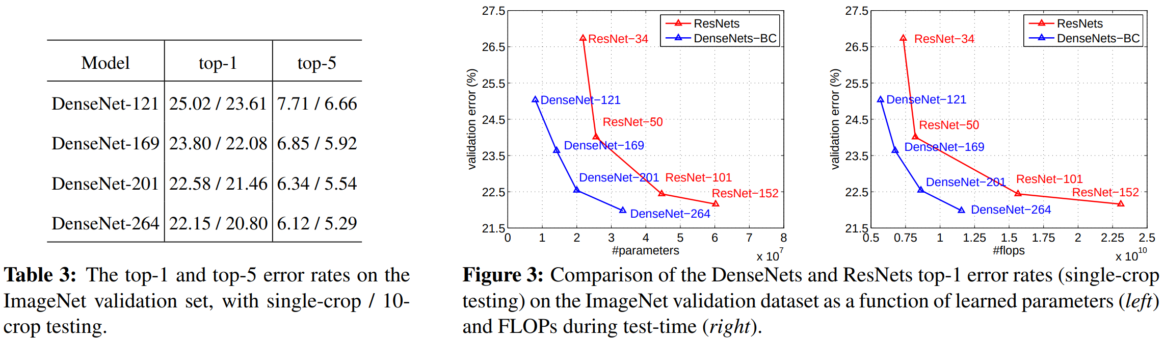 여기서, $[\mathbf{x}_{0}, \mathbf{x}_{1}, \dots, \mathbf{x}_{l - 1}]$이 0번째 계층부터 $l - 1$번째 계층까지의 출력 특징맵의 concat 연산을 의미합니다. 이와 같이 연결이 빽빽하게 (densely)하게 형성되었기 때문에 Dense Convolutional Network라고 정의한 것이죠.