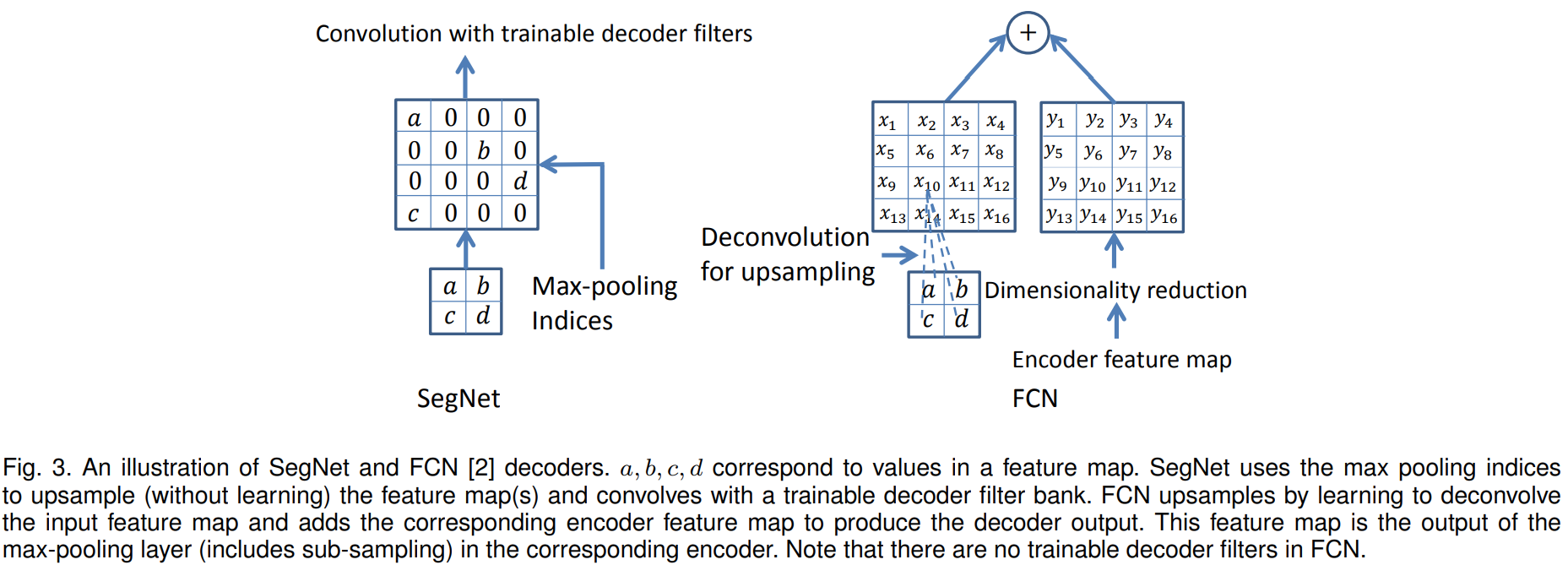 - FCN-Basic: SegNet-Basic과 동일한 인코더와 디코더를 가지지만 디코딩 방식이 deconvolution 방식을 사용