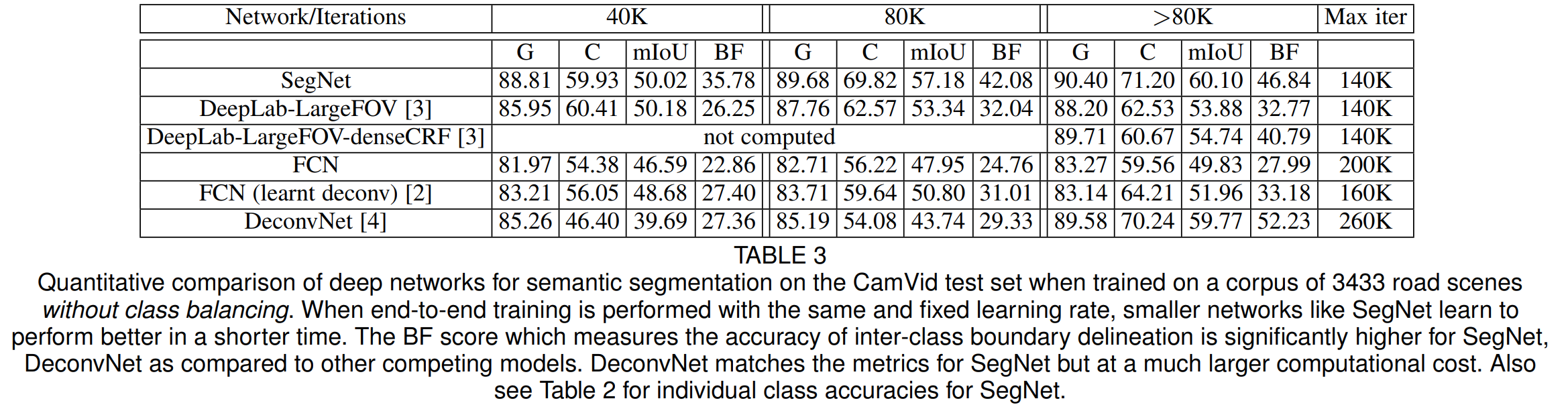 당연하지만, 전통적인 ML 기반의 방법보다 SegNet이 성능이 훨씬 좋다는 것을 보여주고 있습니다.