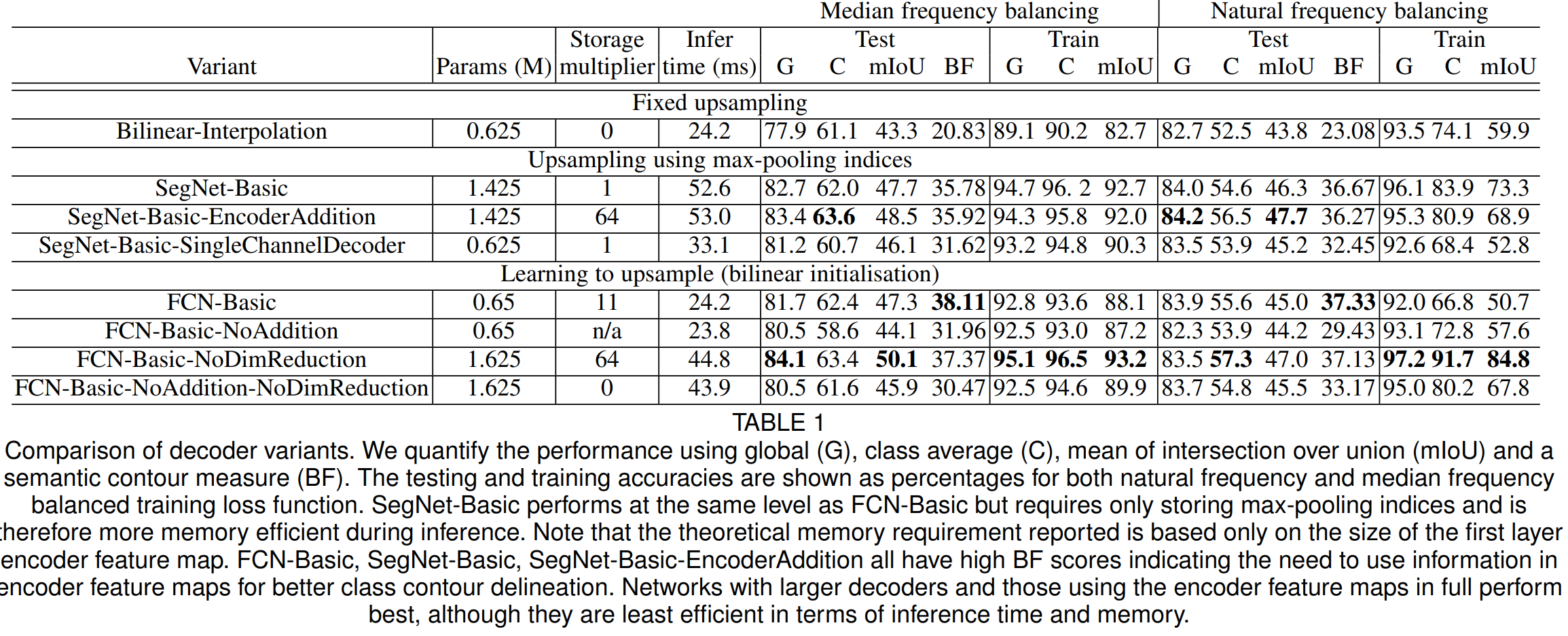 표1은 이전에 설명드린 다양한 디코더 변형에 따른 실험 결과를 보여주고 있습니다. 일단, 성능을 비교해보면 성능 자체는 FCN과 SegNet과 같은 학습 기반의 모델이 Bilinear-Interpolation보다 훨씬 좋다는 것을 알 수 있습니다. 이때, 메모리 사용량 (storage multiplier)는 FCN-Basic이 SegNet-Basic보다 약 11배 더 높은 것을 볼 수 있습니다.
