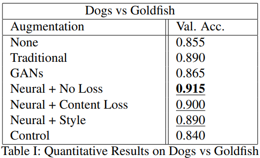 표1은 몇 가지 데이터 증강 및 GAN에서 손실함수를 다양하게 주었을 때 개와 금붕어의 이진분류를 얼마나 잘하는 지에 대한 결과를 나타내고 있습니다.